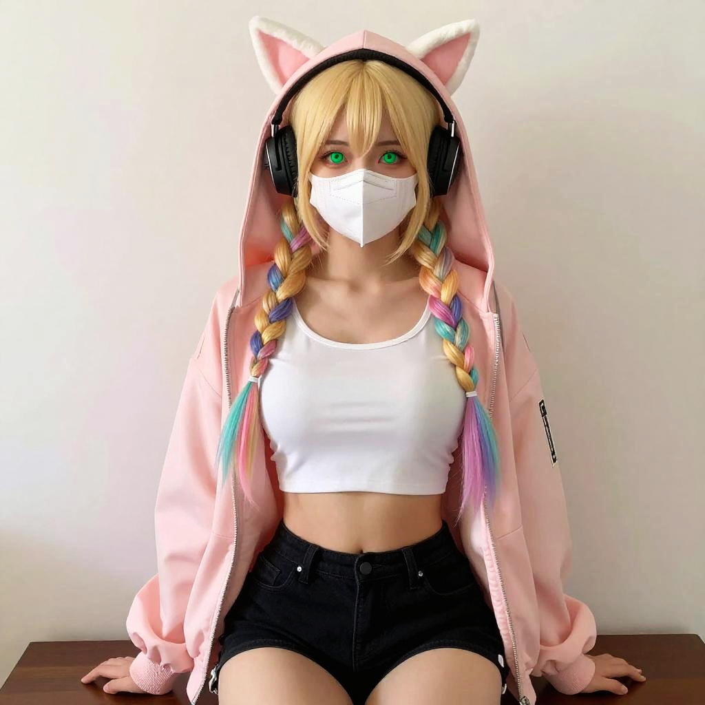 A young woman wearing a pink hoodie with white fake animal ears on the hood, black headphones, and a white face mask. She has long blonde hair braided with pastel rainbow colors and striking green eyes. She is dressed in a white crop top and black short shorts, seated against a plain white background, showcasing a casual and colorful cosplay look with an anime-inspired style.