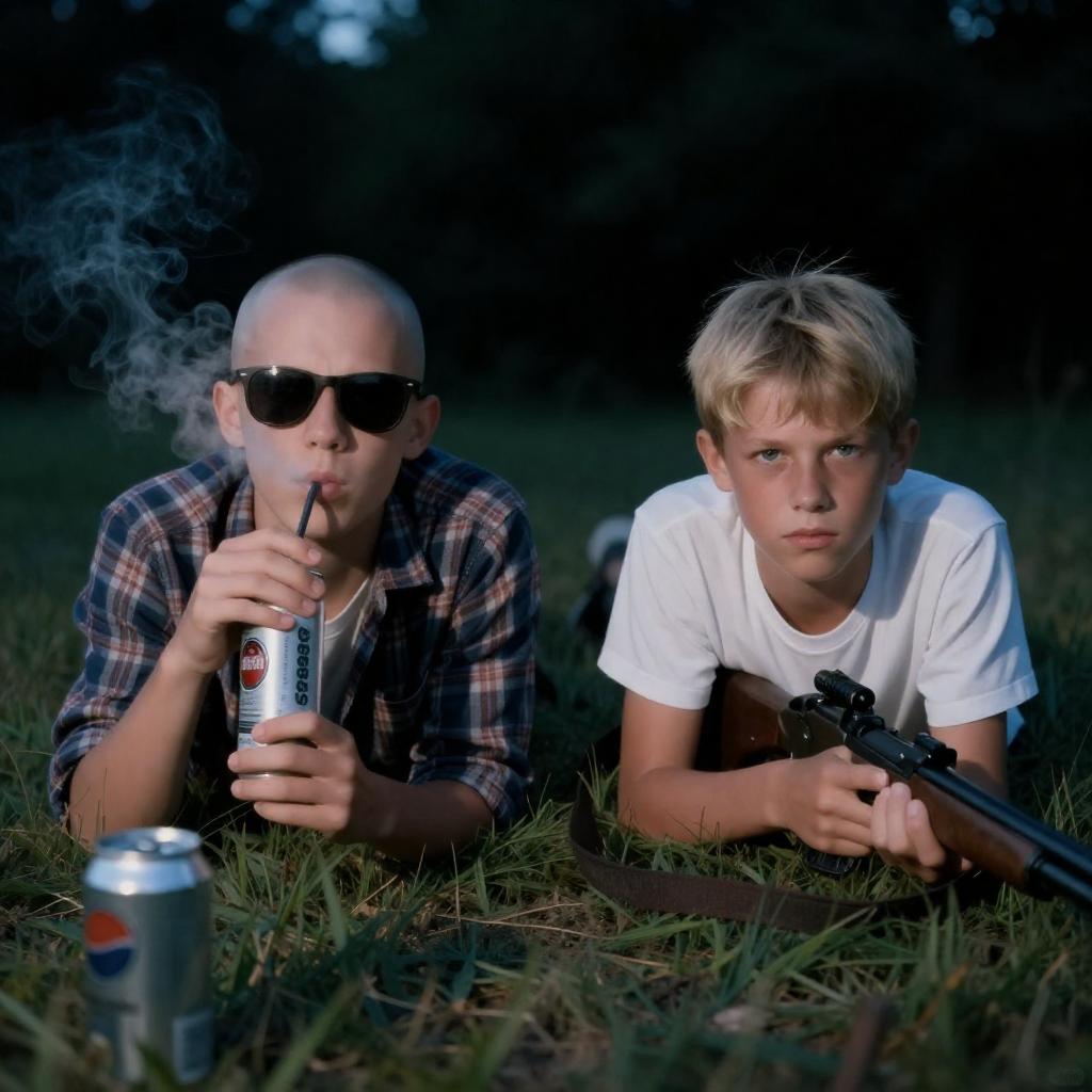 Photograph of three young boys with light brown, blonde, and brown hair, standing in front of a mountainous landscape. They wear plaid and white shirts. Background includes a river, rocky shore, grass, and blue sky. Boys have neutral expressions.