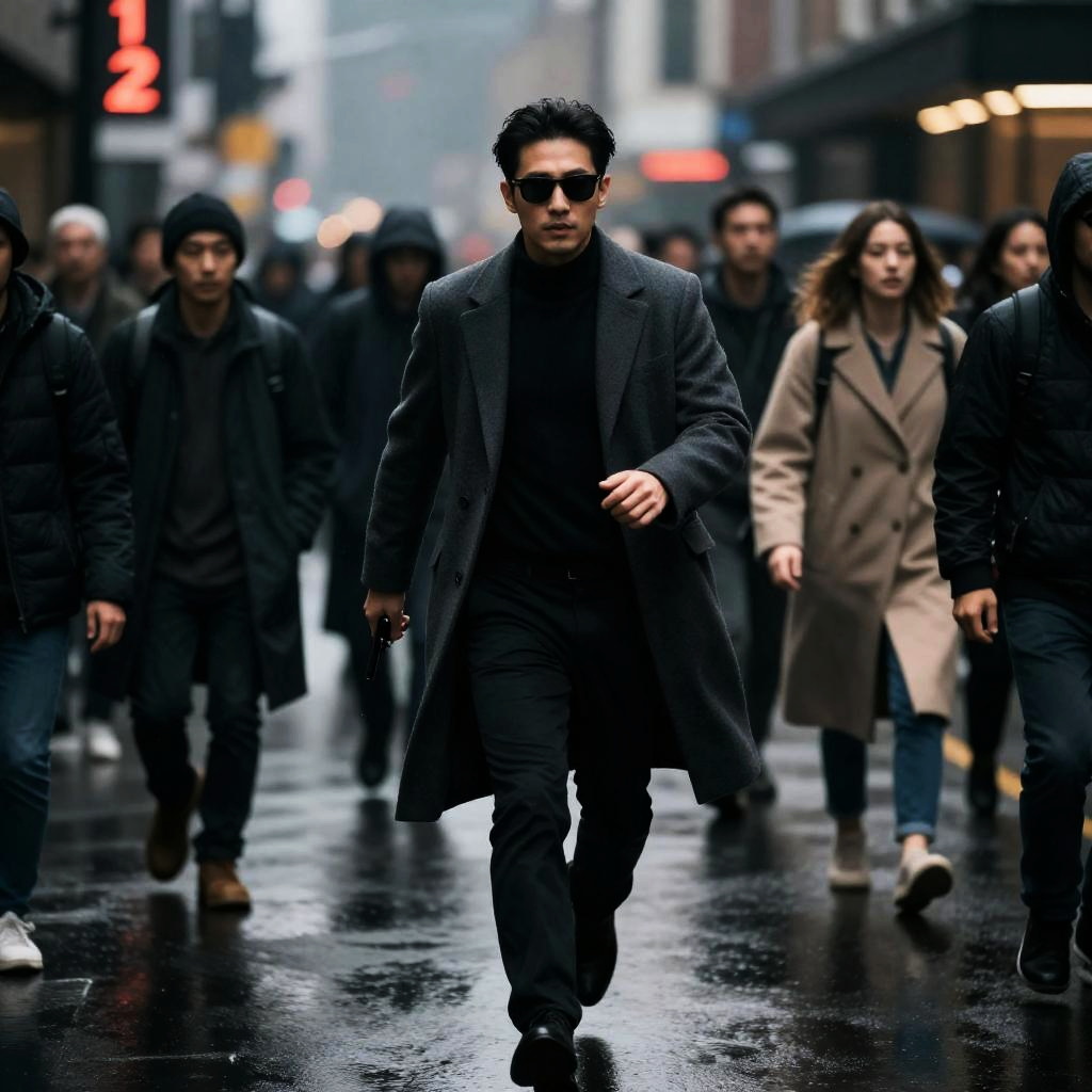 Cinematic Man Running in Rainy City