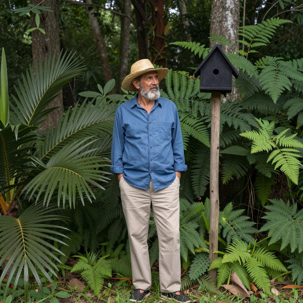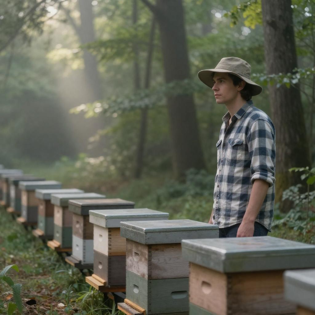 Photograph of a man in a forest. He wears a checkered shirt, blue jeans, and a wide-brimmed hat. He stands in front of a row of wooden beehives. Sunlight filters through trees, creating light beams. Man has glasses and a neutral expression. Dense green foliage surrounds him.