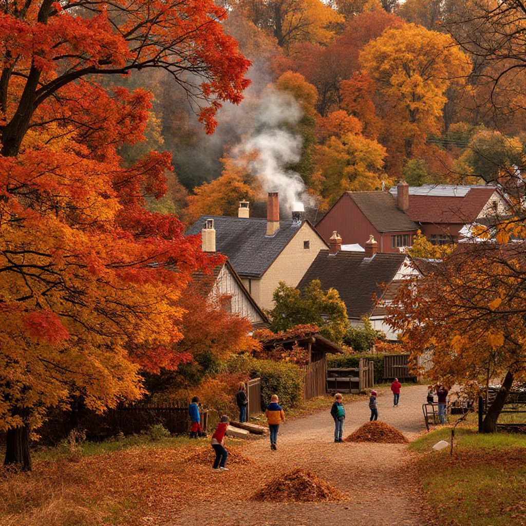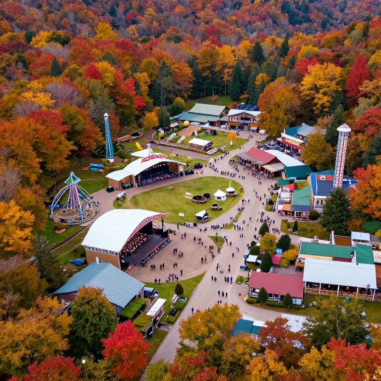 A detailed aerial view of Dollywood nestled in the Smoky Mountains, vibrant autumn foliage with red and gold leaves, busy pathways winding between stages, shops, and rides, showing the lively spirit and natural beauty surrounding the popular mountain destination.