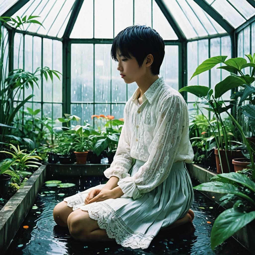A curious teenage boy, wearing a delicate lace blouse and long skirt, sitting in a tranquil botanical greenhouse, surrounded by vibrant plants and dripping water droplets, drawn in the deeply emotional and realistic anime style of Inio Asano.