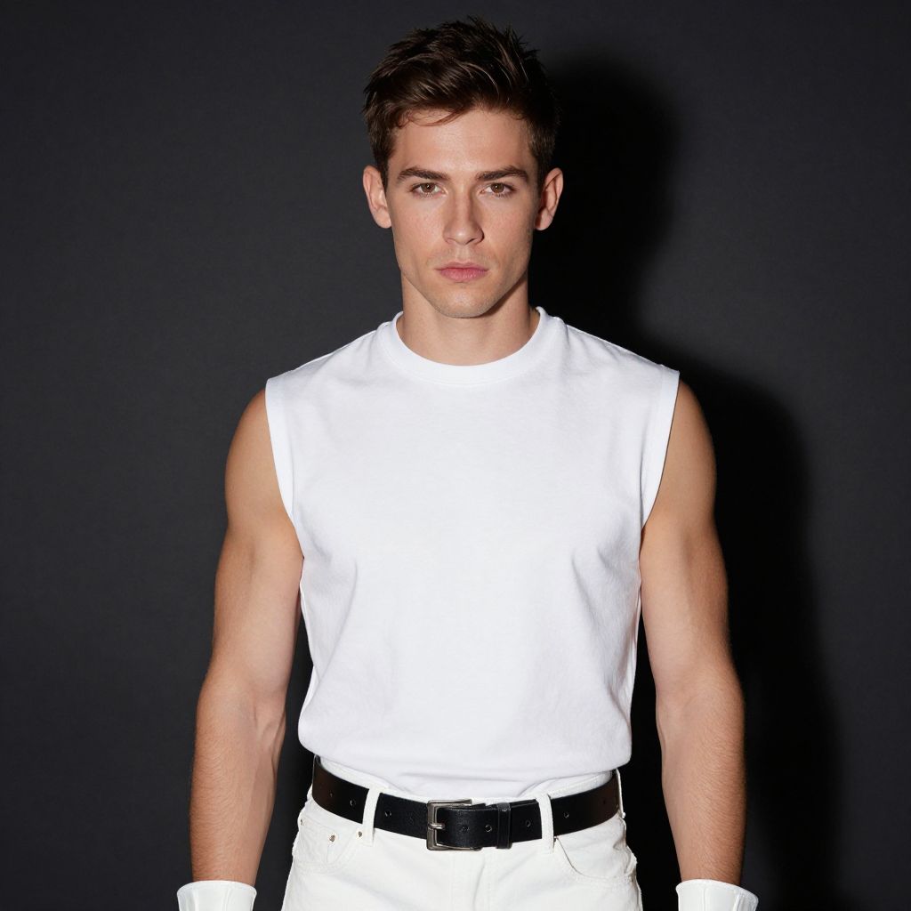 Photograph of a young, white male model with short, dark brown hair and fair skin, standing against a solid black background. He has a lean, muscular build and is wearing a sleeveless, white, form-fitting shirt that highlights his arms. His pants are also white, with a black belt, and he has white gloves on his hands. The lighting is bright, creating a stark contrast with the dark background, and casting a subtle shadow behind him. His expression is neutral, and he gazes directly at the camera.
