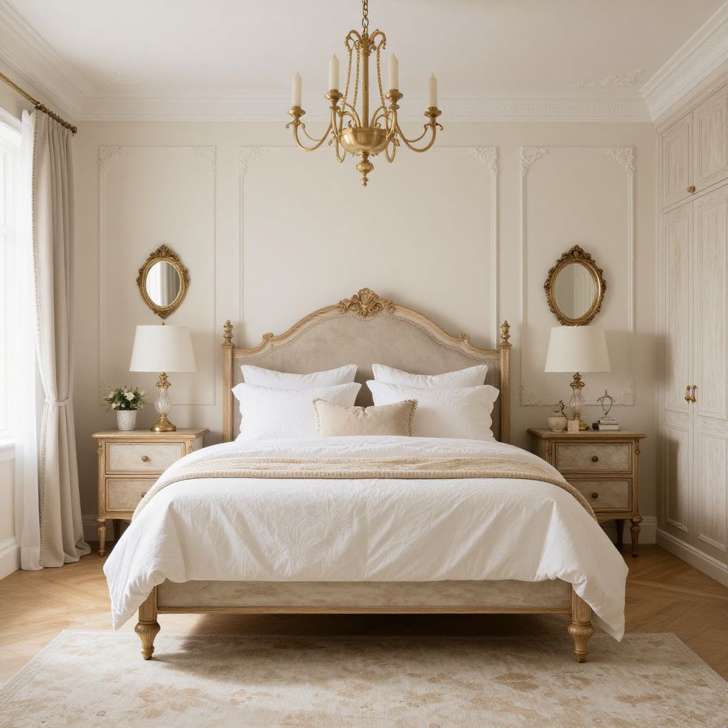 Elegant bedroom photograph: white bedding, ornate gold headboard, vintage wooden nightstands, gold chandelier, oval mirrors, soft natural light,