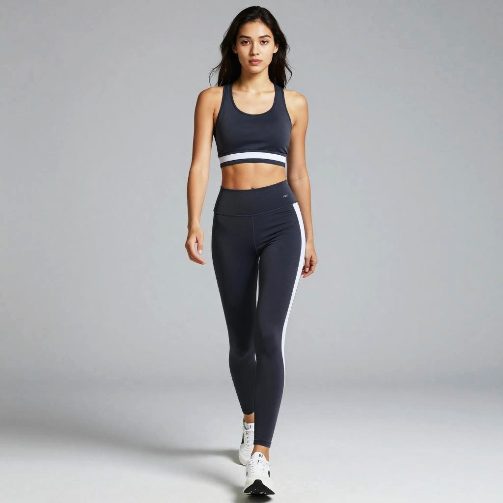 A young woman confidently strides forward in a sleek, sporty outfit, perfect for fitness activities. The modern athletic wear features a fitted design with contrasting stripes, set against a minimalist gray backdrop that emphasizes her poised demeanor and motivation.
