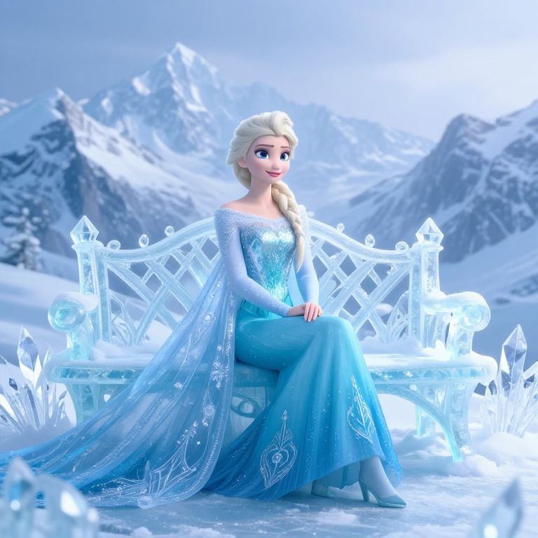 Elsa sitting on an ornate ice bench surrounded by crystal sculptures, her regal dress flowing with icy patterns, majestic snowy mountains in the background, ethereal light casting soft shadows, concept art style with a fantasy mood and intricate details