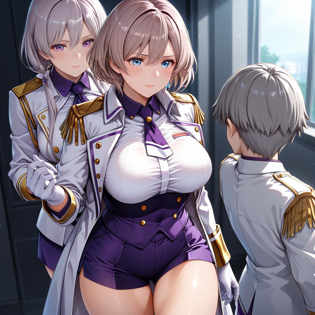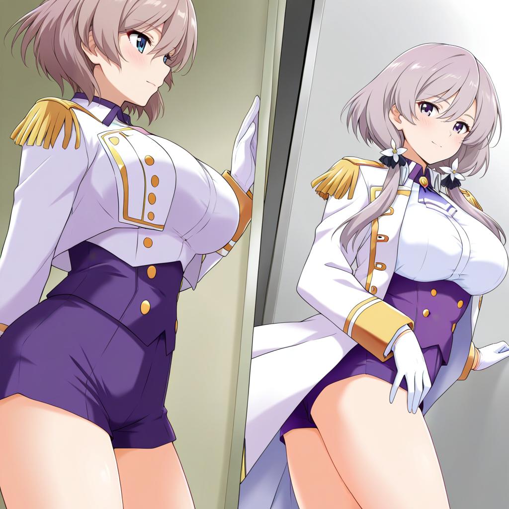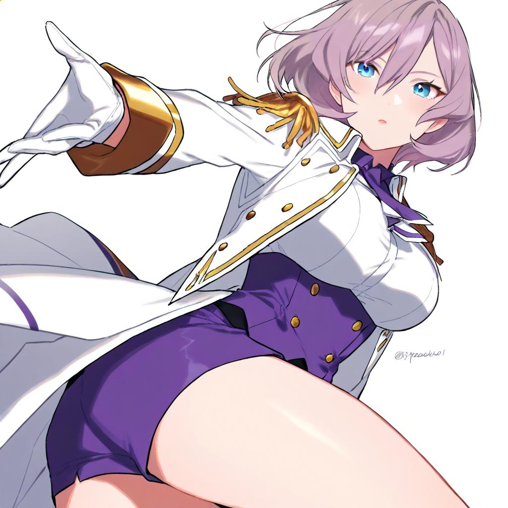 Mujina, gridman universe, 1girl, blue eyes, hair between eyes, short hair, brown hair, grey hair, large breasts, thighs, white gloves, white jacket, military jacket, purple shorts, corset, by artist fusu (a95101221), animagine