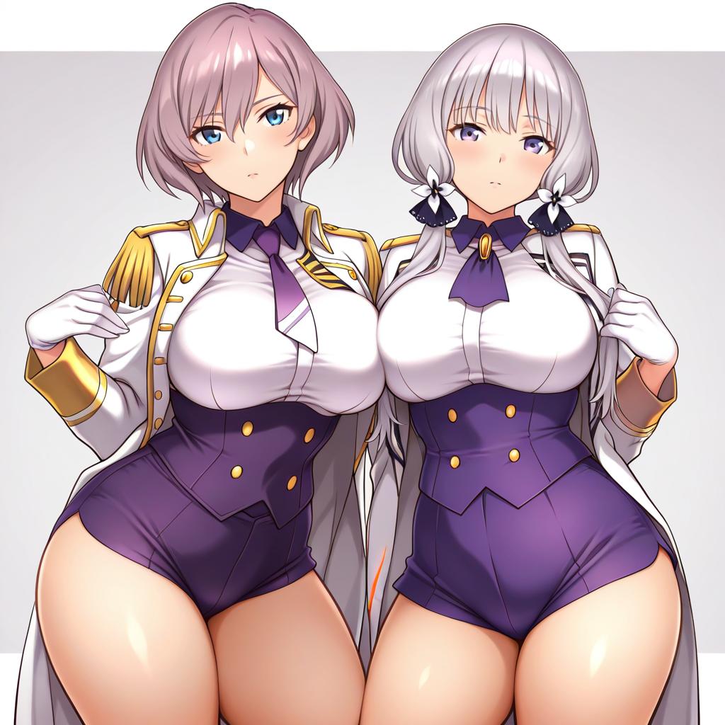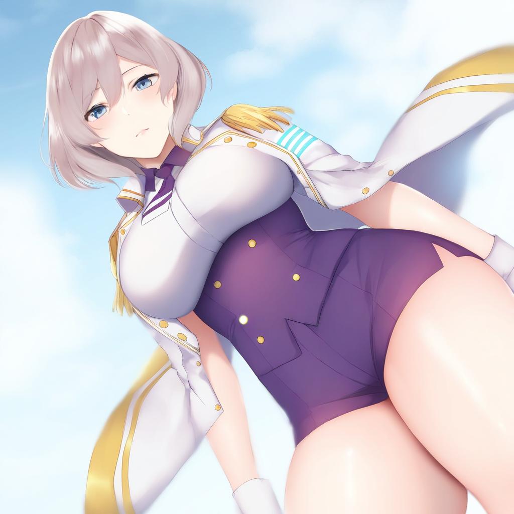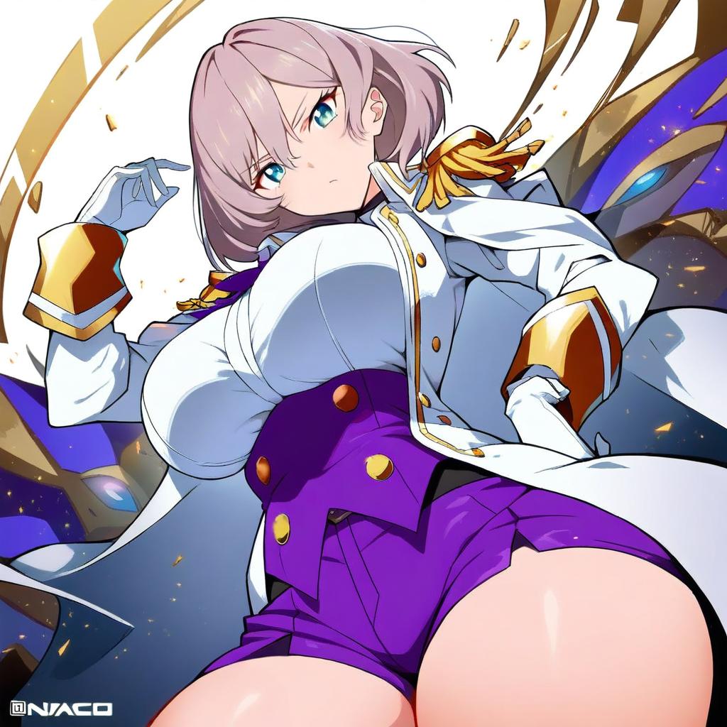 Mujina, gridman universe, 1girl, blue eyes, hair between eyes, short hair, brown hair, grey hair, large breasts, thighs, white gloves, white jacket, military jacket, purple shorts, corset, by artist fusu (a95101221), animagine