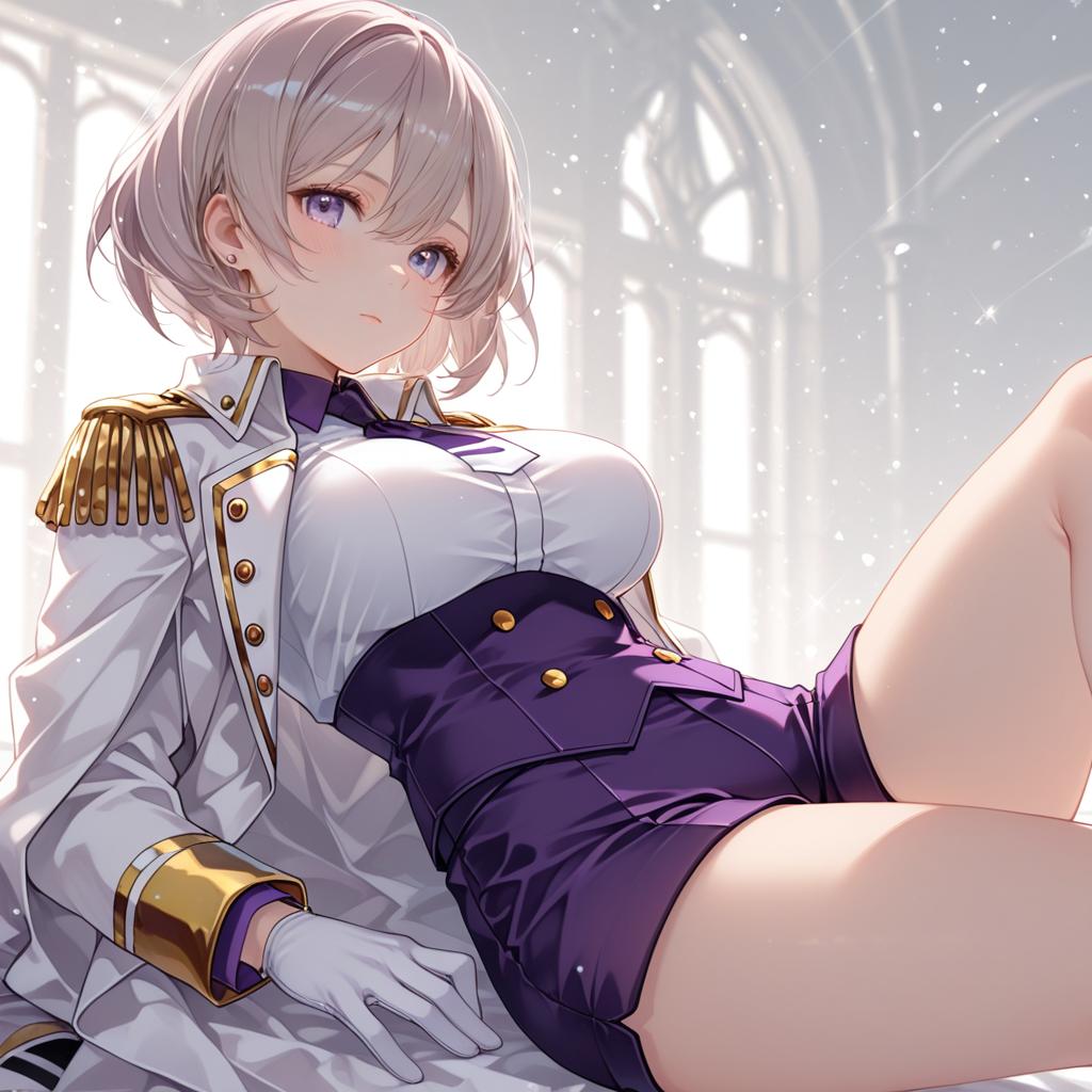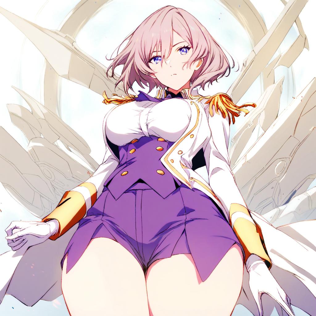 Illustration of a young anime girl from the Gridman universe, featuring short greyish-brown hair, blue eyes, and a confident expression. She is dressed in a white military-style jacket with gold and orange detailing, white gloves, and a fitted purple corset and shorts. The pose is dynamic, viewed from a low angle emphasizing her large breasts and thighs, set against a light patterned background.