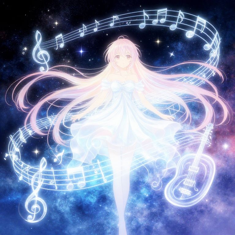 Digital anime-style illustration depicting a glowing, ethereal figure with long, flowing white hair, illuminated by radiant light. The figure stands centered, surrounded by swirling, neon musical notes and treble clefs, creating a dynamic, musical aura. The background is a starry, cosmic landscape in deep blues and purples, adding a sense of vastness and wonder. The light from the figure and the musical notes creates a luminous contrast against the dark, starry backdrop. The overall style is fantastical and otherworldly, blending elements of music and space.