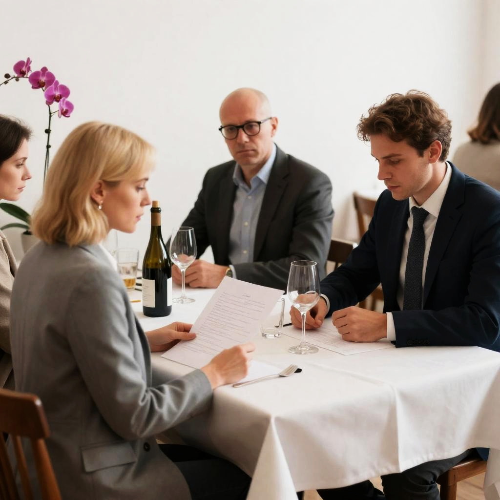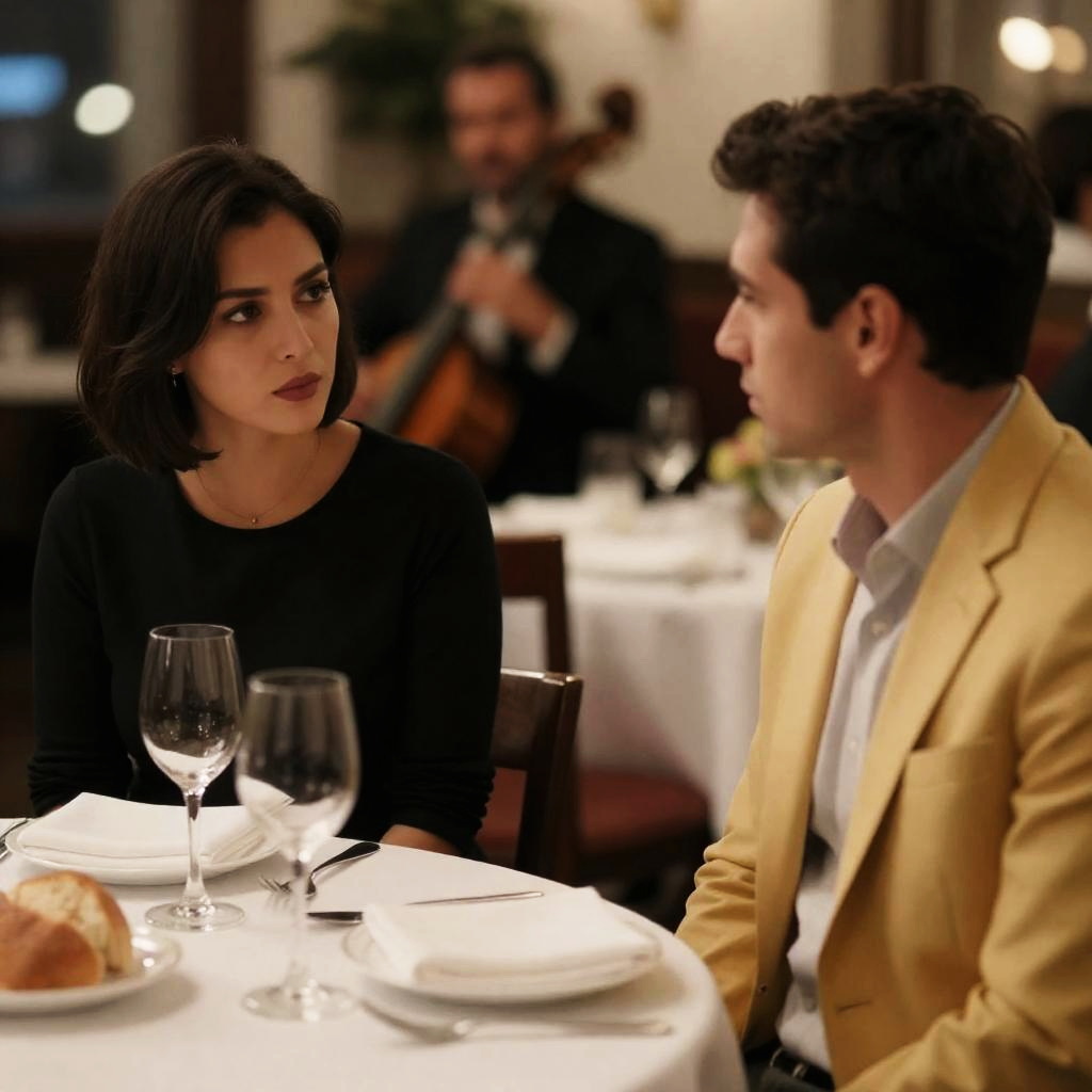 Two women in a dimly lit restaurant, seated at a table. One with dark hair in a green dress, the other with blonde hair in a striped sweater. Bottle of wine, glass, and basket on the table. Both women look at each other, engaged in conversation. Wood-paneled walls in the background.