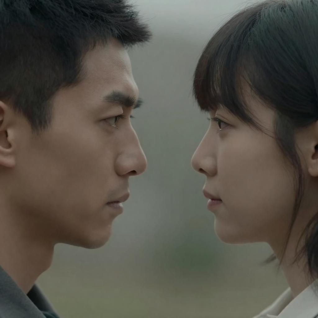 Close-up photograph of two people, a man and a woman, in a tense face-to-face confrontation. Man on left has dark hair, Asian features, and focused expression. Woman on right has short black hair, Asian features, and slightly blurred face. Background is out of focus.