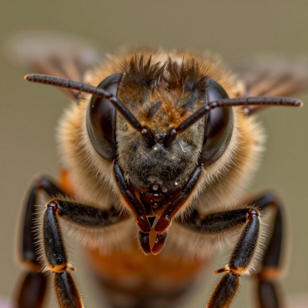 Ultra-macro close-up of honey bee face, hyper-detailed compound eyes, fine antennae and mouthparts in sharp focus, eyes in honey brown with soft gradient to dark rim, tiny hairs and textures clearly visible, shallow depth of field, warm brown and olive gradient suggesting foliage, gentle top-down light bringing out structural detail, captured with professional macro lens, insanely detailed, crisp focus on eyes and head, photorealistic insect macro photography
