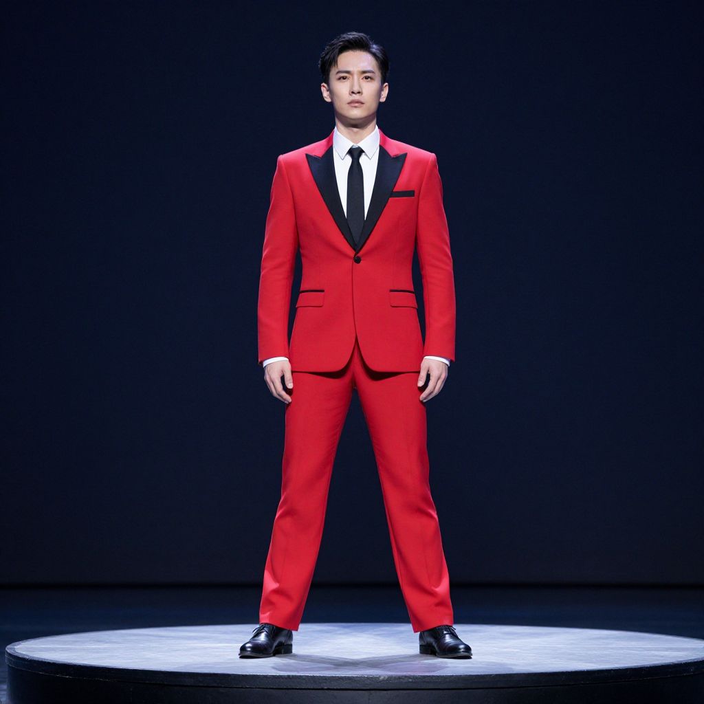 Photograph of a young Asian man standing confidently on a circular stage against a dark, black background. He wears a vivid red, single-breasted suit with black lapels and buttons, paired with a white dress shirt and black tie. His black hair is neatly combed, and he sports black dress shoes with a slight shine. The stage lighting highlights his suit, creating a stark contrast with the dark background. He stands with his feet slightly apart and hands relaxed by his sides, exuding a poised and composed demeanor.