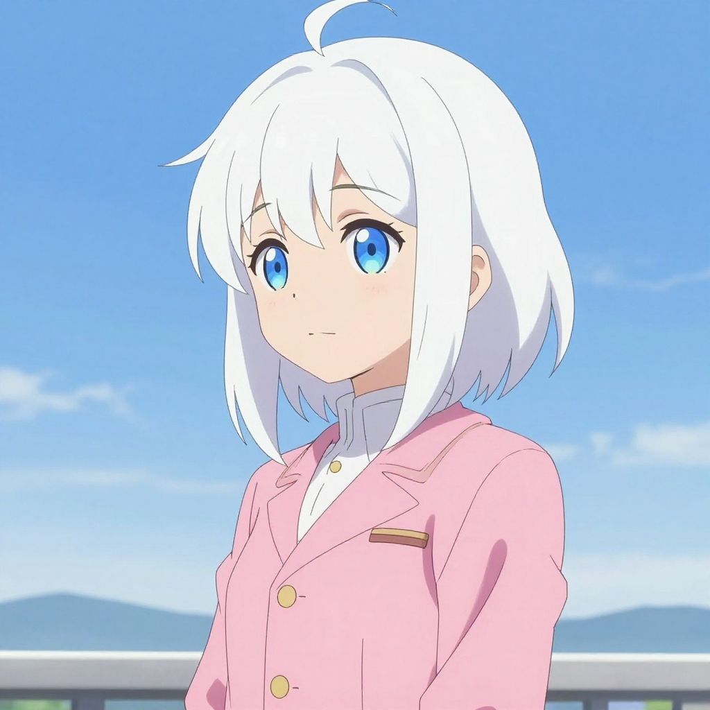 1girl, solo, pink theme, white hair, blue eyes, outdoors, uniform, upper body, blue sky, scenery, horizon