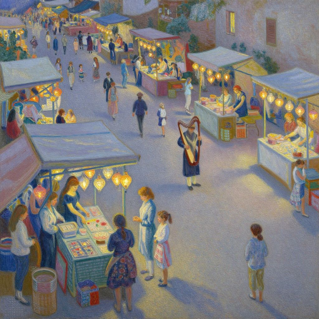 Free oil painting illustrating a lively urban street scene, colorful storefronts, busy pedestrians, and atmospheric perspective, using expressive brushstrokes and a harmonious palette to capture everyday life.
