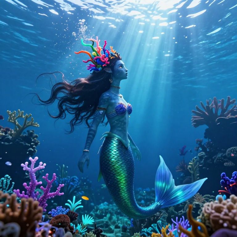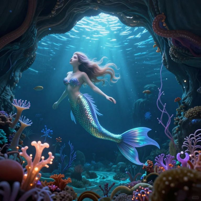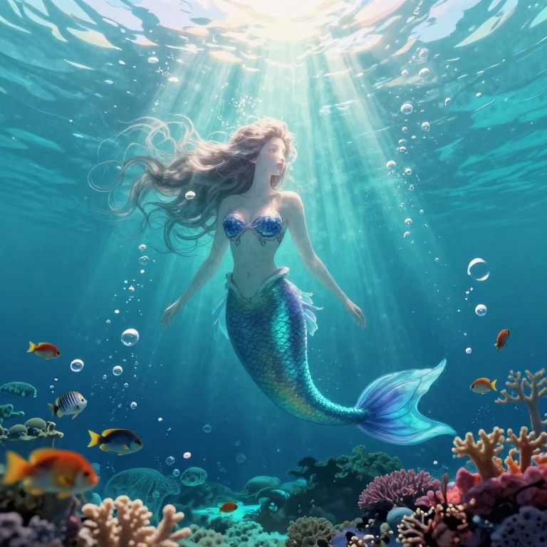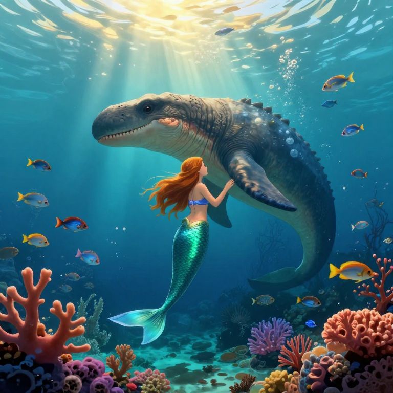 Craft an enchanting underwater tableau reminiscent of James Gurney's Dinotopia, depicting a tranquil mermaid in harmony with an ancient brachiosaur. The scene abounds with lush coral gardens and darting schools of luminescent fish, enveloping them in a vibrant aquatic landscape. Soft, golden light bathes their intricate forms, imbuing the tableau with an ethereal charm that stirs intrigue for the concealed realms beneath our sight. This expansive image captures a tender embrace between two species, emblematic of unity and comprehension amidst nature's splendor.