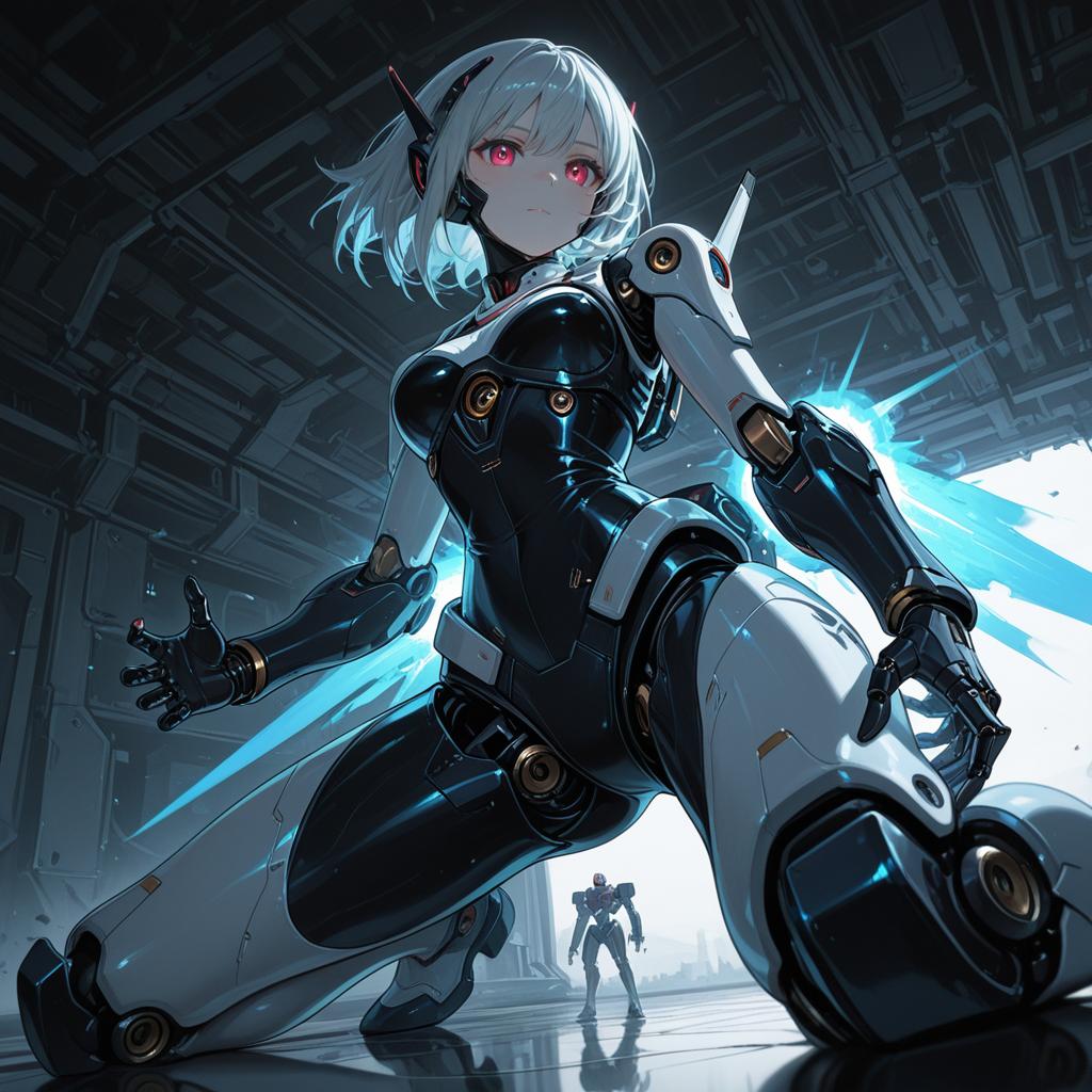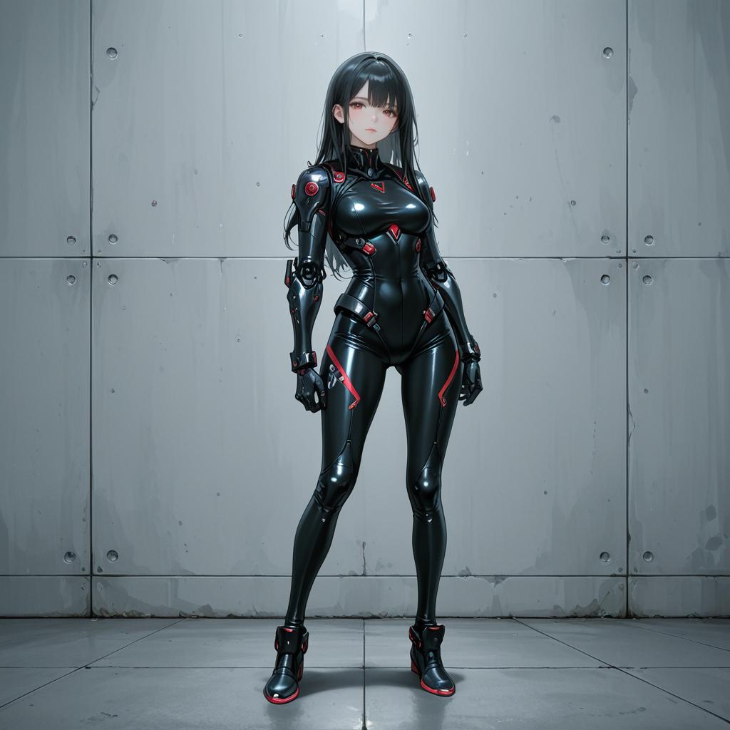 Masterpiece, best quality, 1girl, genshinmona, black hair, bodysuit, full body, mechanical arms, medium breasts, science fiction, solo, standing