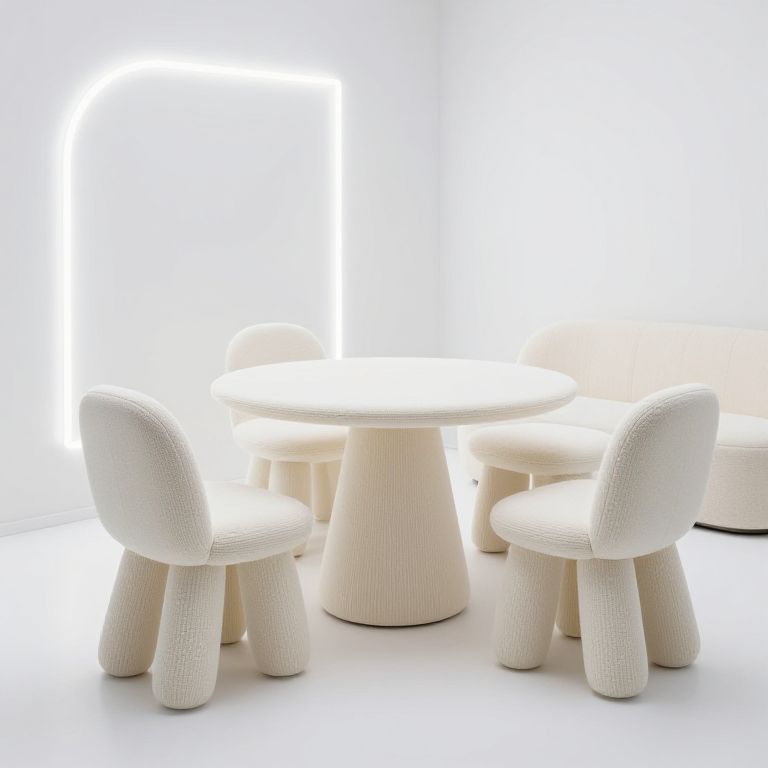 Hand Quilting Biomimicry furniture design, chair, table and sofa. white interior space, neon back light,