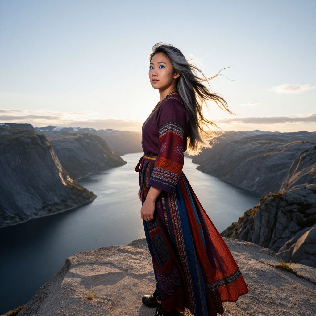 Imagine a captivating portrait of an East Asian woman with striking blue eyes and long hair streaked silver, blowing in the wind from a dynamic low-angle perspective. She stands atop a rugged cliff overlooking a pristine fjord, her silhouette illuminated by the warm glow of the setting sun. The vibrant colors and textures of her traditional dress contrast against the untamed landscape, evoking an emotional spectrum ranging from freedom and adventure to serene tranquility as she embraces nature's beauty and raw power in this breathtaking coastal panorama.