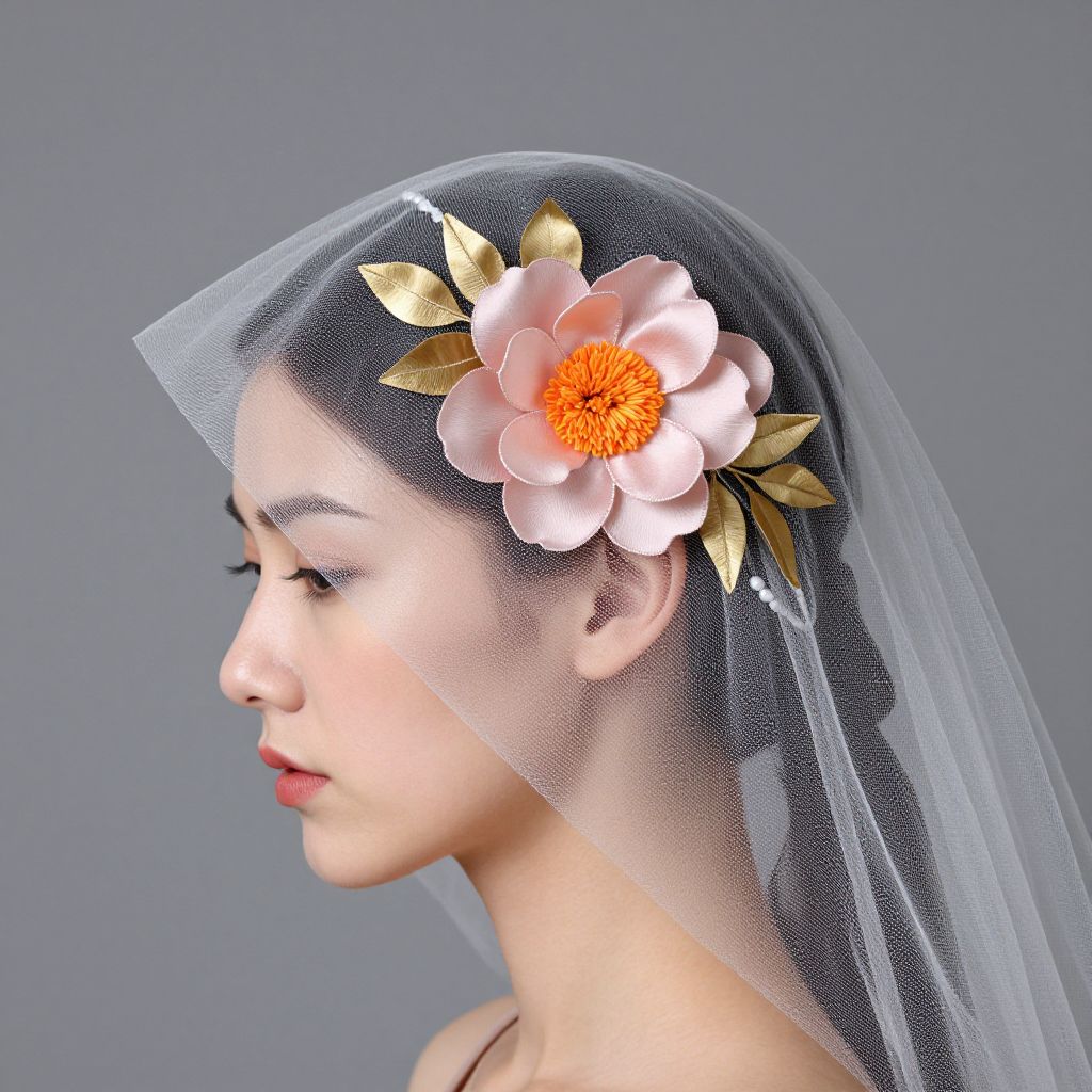 Photograph of an Asian woman in profile against a plain gray background. She has fair skin, dark hair pulled into a neat bun, and is wearing a white, sheer veil that drapes over her head. Adorning her hair is a large, pink flower with a yellow center and gold leaves. The flower and leaves are detailed and realistic. She has subtle makeup, with pink lips and faint eye makeup. She wears a white garment, visible at the bottom of the image. The soft lighting highlights her delicate features and the intricate floral headpiece.