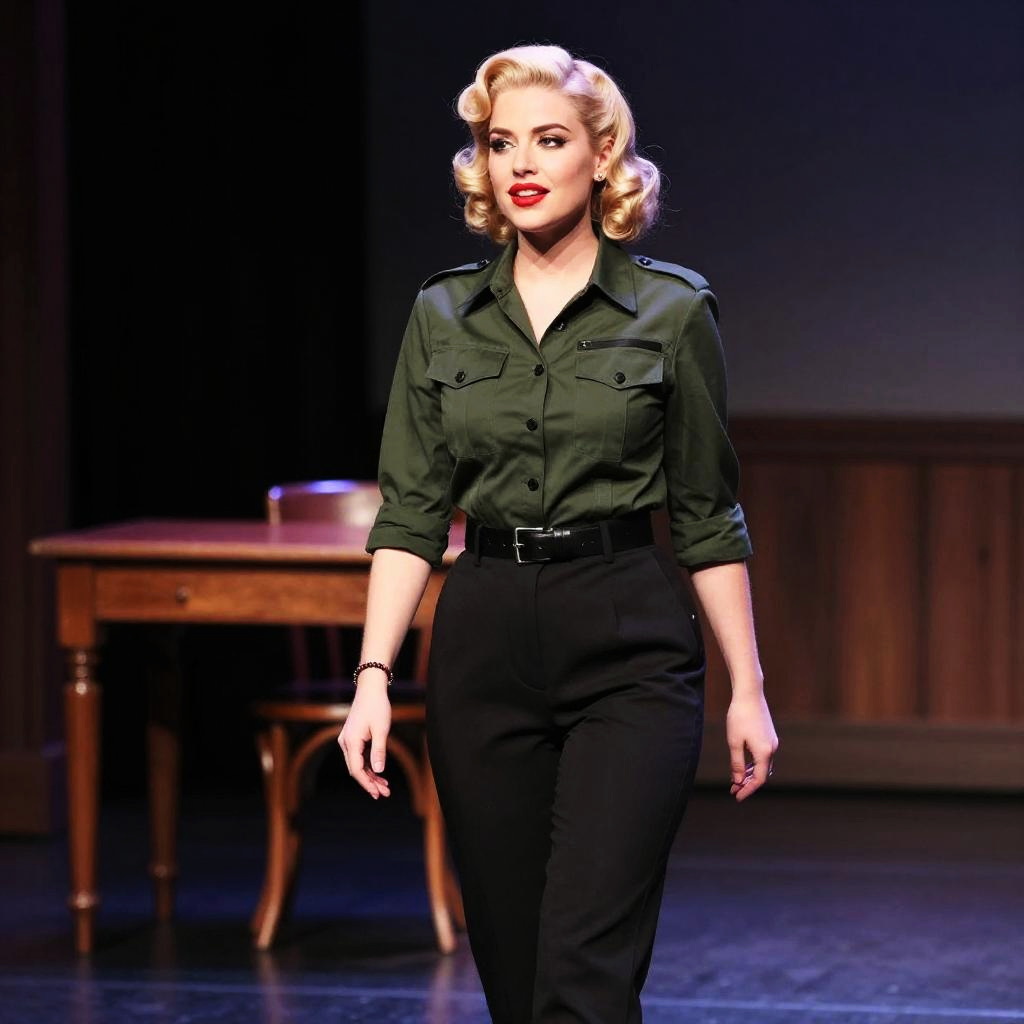 Photograph of a blonde woman with curled hair and red lipstick, standing on a stage. She wears a dark green, button-up military-style shirt with black trim and high-waisted brown pants with a black belt. Her arms are relaxed by her sides. The background shows a dimly lit room with a wooden table and chair, and a closed door. The stage lighting highlights her, casting soft shadows. The overall style is reminiscent of mid-20th century fashion, evoking a vintage or retro feel.