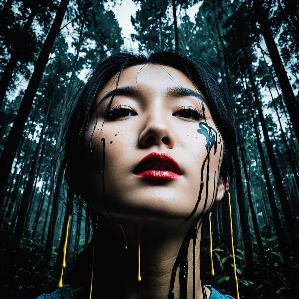 Realistic photo.A high-definition pop art painting of an enchanting Asian woman's visible face, facing the camera and looking up against a mystical forest backdrop on a low-key black background. The artwork employs rich, deep colors with dramatic dripping paint effects that convey intensity and emotion. The composition blends a whimsical natural setting with pop art aesthetics, creating a bold and visually captivating piece with a sense of energy and impact.