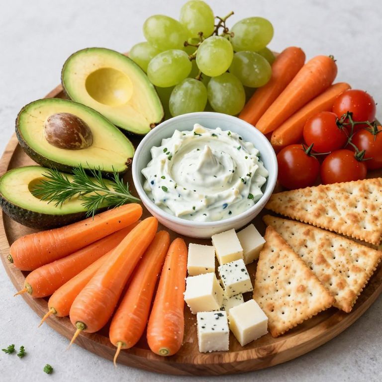 Colorful antipasto platter featuring halved avocados, vibrant green grapes, crisp carrots, cherry tomatoes, fresh herbs, crumbled cheese cubes, crackers, and a creamy dip nestled in a decorative bowl, all artfully arranged on a wooden board, evoking a Mediterranean-inspired summer feast.