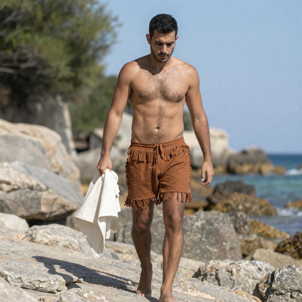 Shirtless man with short dark hair and chest hair, wearing fringed brown shorts, walks along a rocky beach holding a white cloth. Background: green shrubs, rocky cliffs, clear blue sea. Man's expression: focused, slightly intense. One person, standing, walking.
