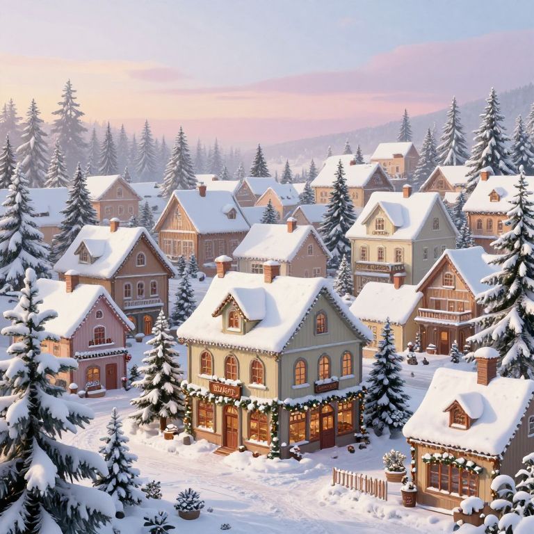 Digital illustration of a snow-covered suburban neighborhood with charming, wooden houses, lit windows, and evergreen trees, set against a pink and blue sunset sky