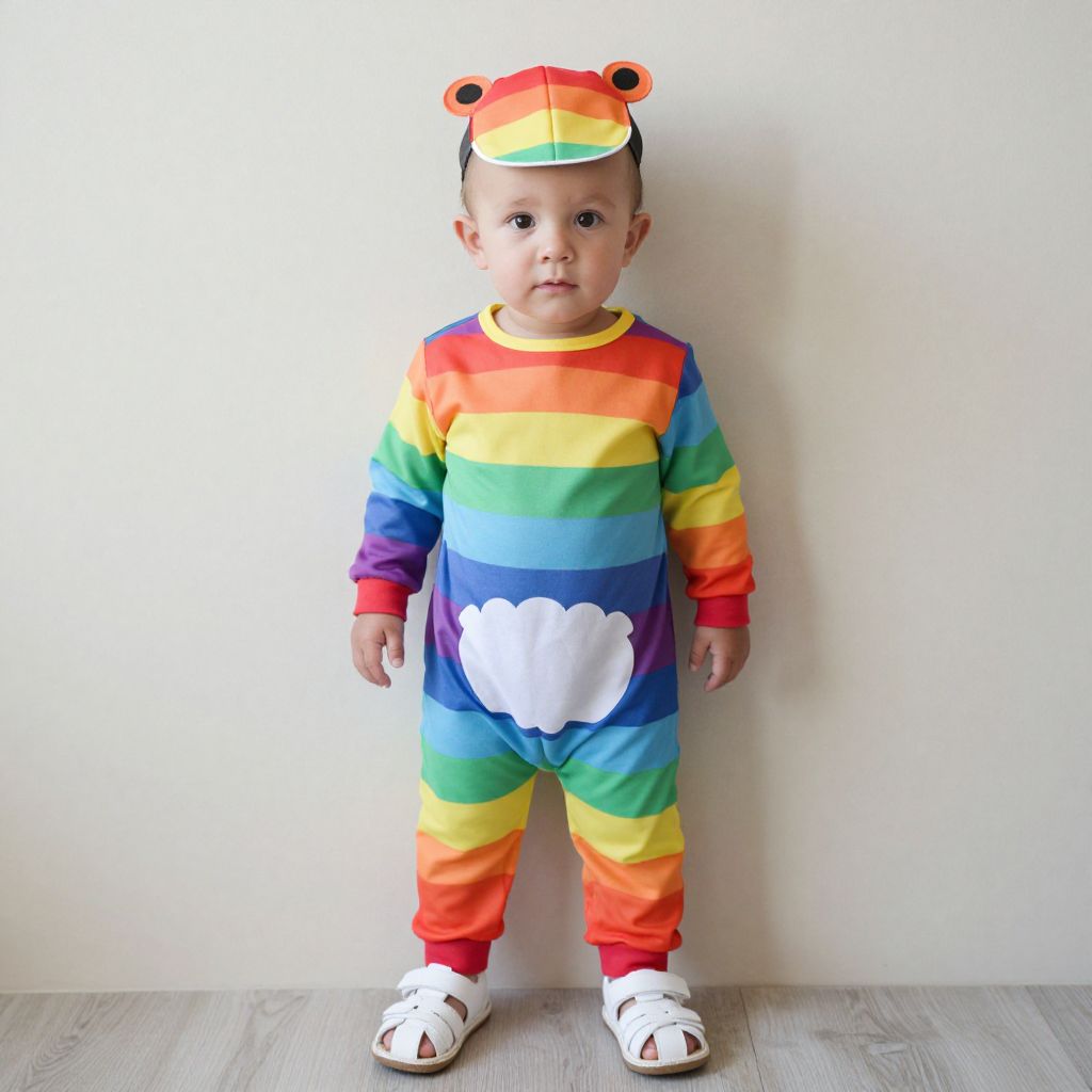 Rainbow brite infant costume, solo, male focus, 1boy, full body, standing, multicolored clothes, looking at viewer, closed mouth, sandals, black eyes