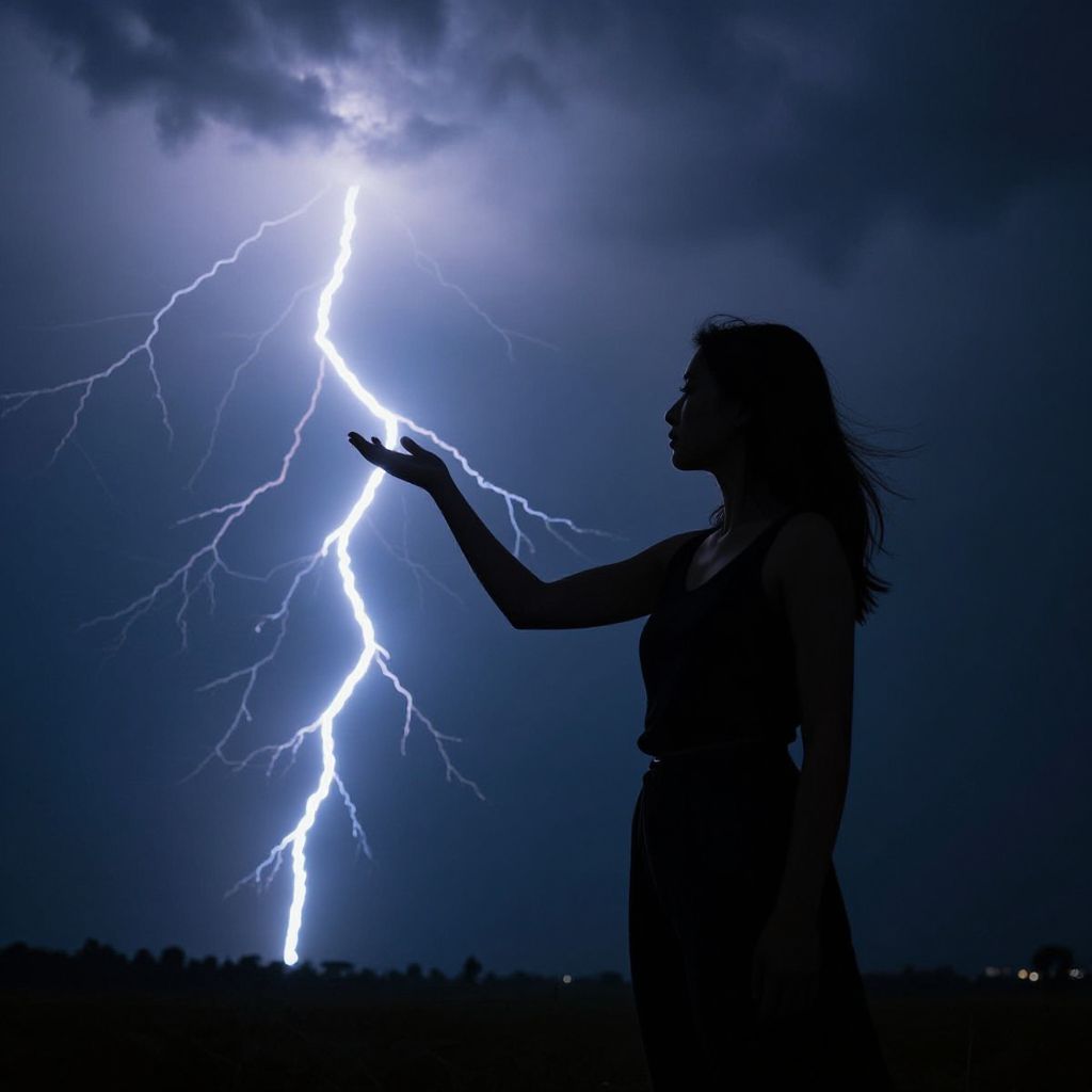 A woman stands silhouetted against a stormy night, her hand outstretched as if summoning lightning, which forks and dances like living energy, defying the boundaries between human will and natural force.