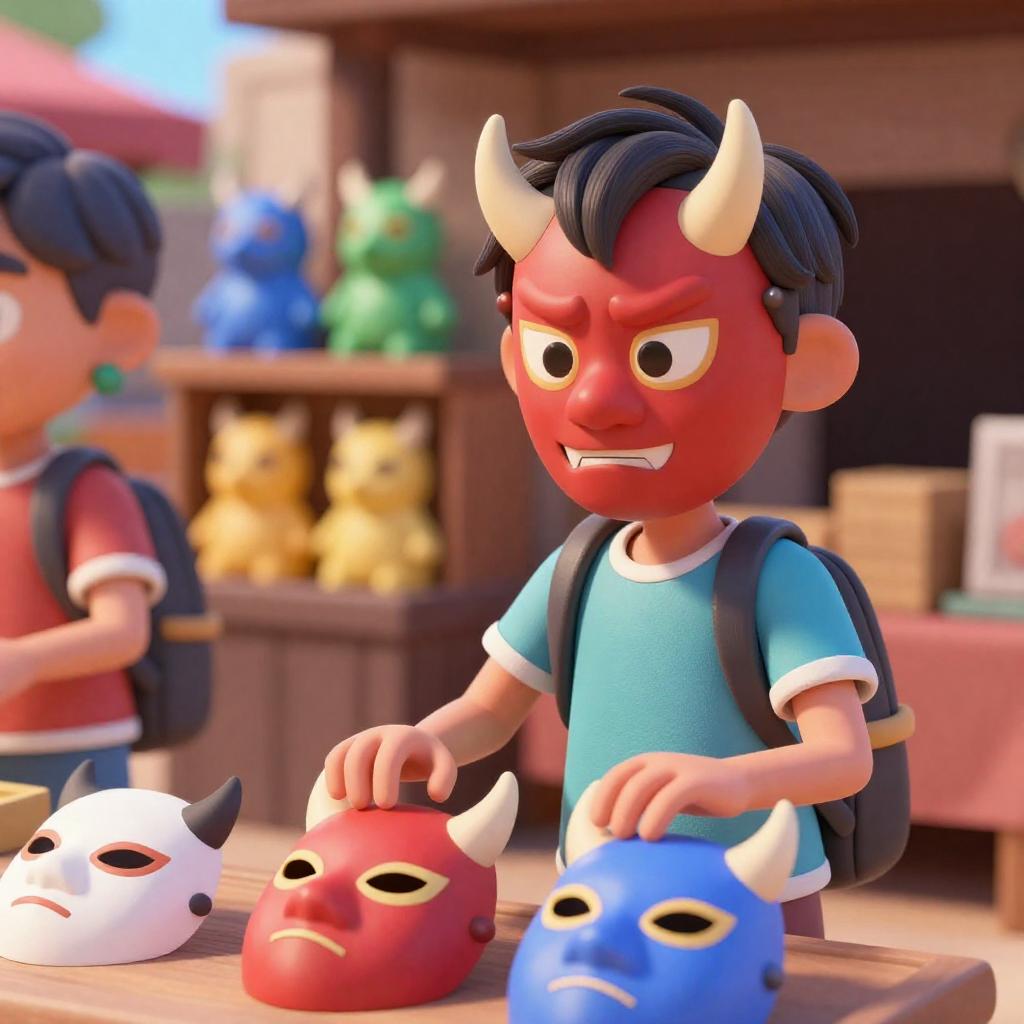 3D CGI scene. Asian boy wearing red demon mask, light blue shirt, backpack, stands at market stall. Red, blue, and white masks on table. Market background with stone structures. Second person with dark hair, red shirt, green earrings, left side. Blue, green, and yellow figures on shelf in background. Boy's hands near mask, intense expression.