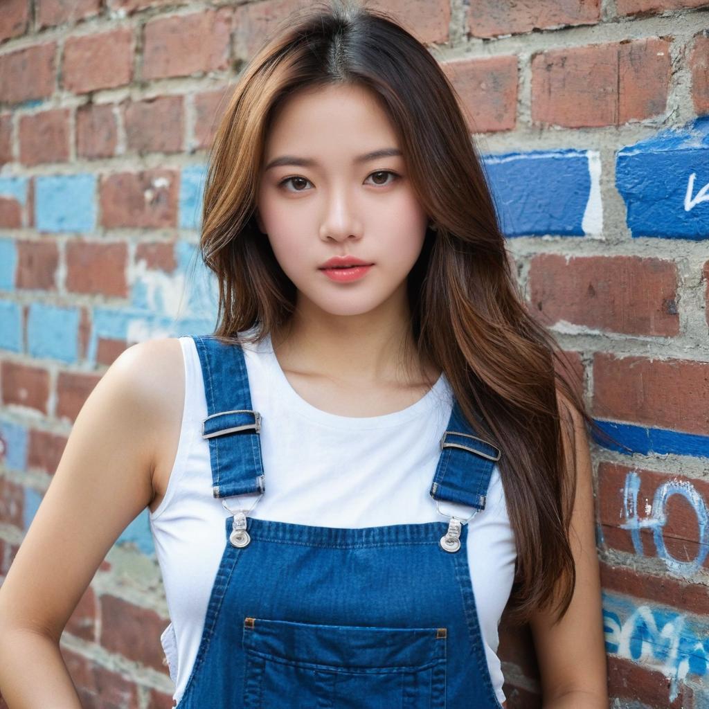 Asian Woman in Blue Denim Overalls Against Graffiti Brick Wall