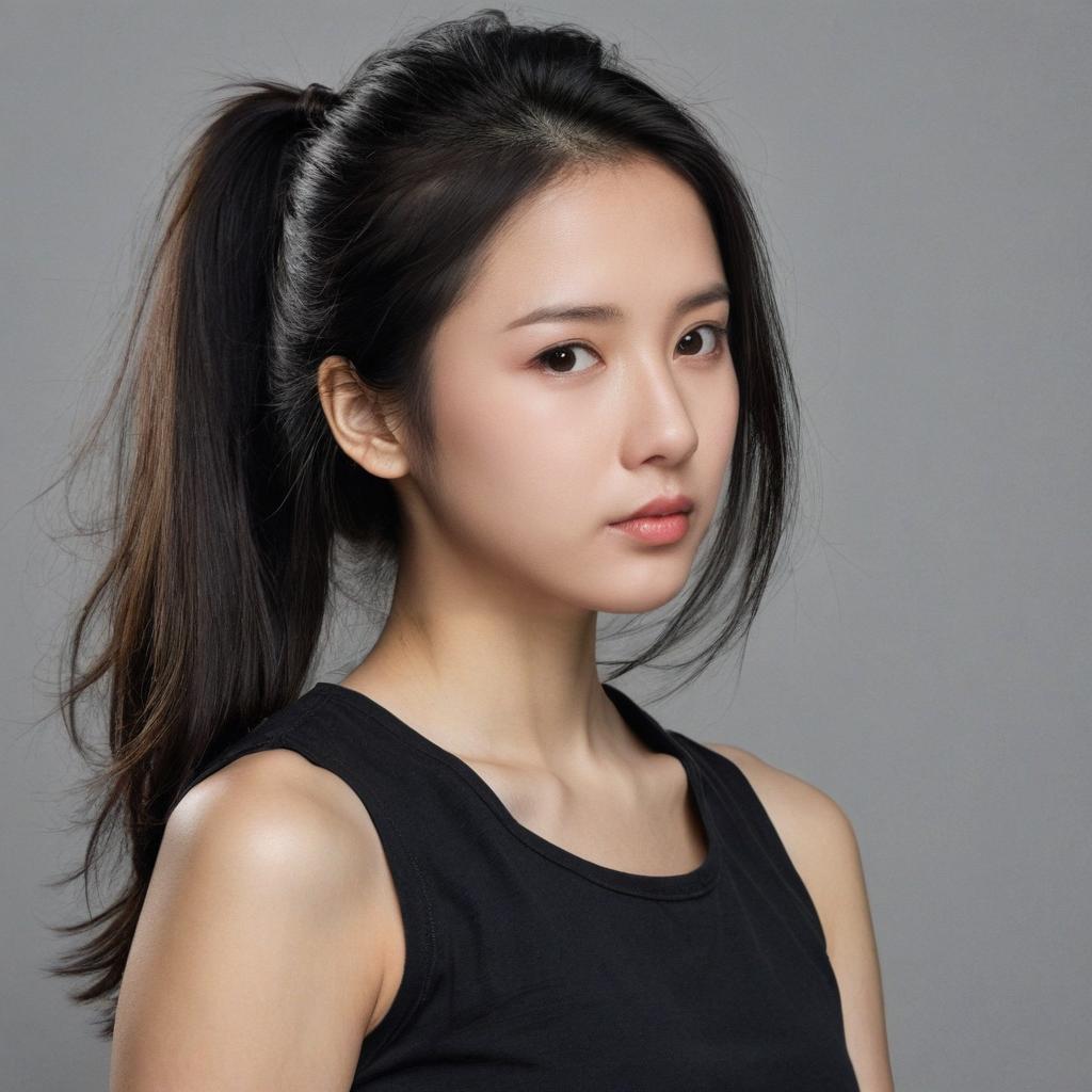 Portrait of an Asian woman with long brown hair and brown eyes wearing blue denim overalls and a white sleeveless shirt, standing against a brick wall with blue graffiti. The image captures her upper body with a slight head tilt, showcasing a photorealistic, traditional media style.