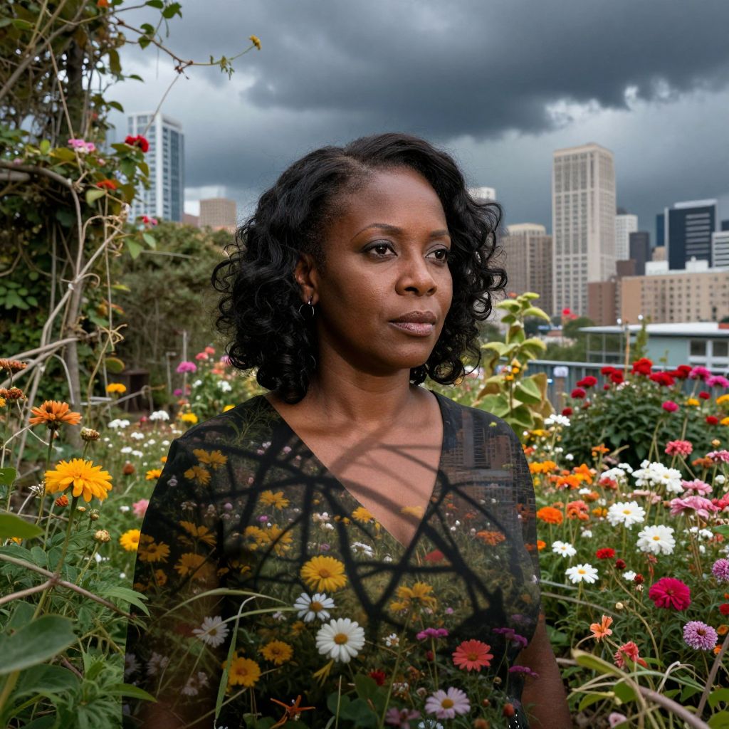Photograph of an African-American woman with dark skin and curly black hair, wearing a sheer black top with floral patterns. She stands in a vibrant garden filled with colorful flowers, including orange, yellow, white, and pink blooms. The background features a cityscape with tall buildings under a stormy, cloudy sky. The woman's expression is calm and introspective. The image is rich in contrast, with the dark clouds and her sheer top highlighting the bright flowers and cityscape. The garden is lush, with various plants and flowers surrounding her.
