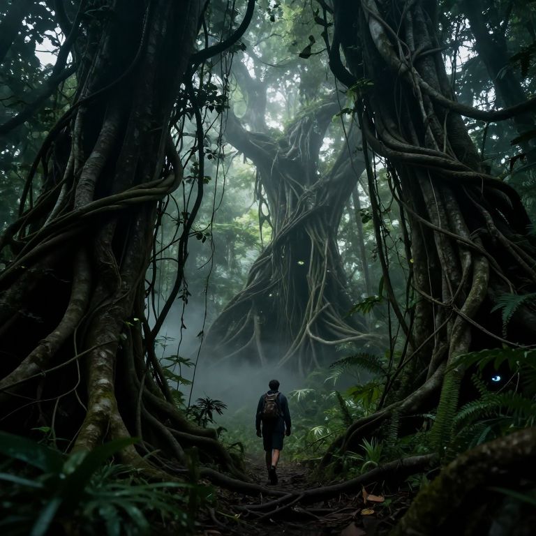 Photorealistic digital artwork depicting a dense, misty jungle with towering, intricately tangled vines and massive tree trunks. A lone figure, a person with short dark hair, wearing a dark jacket and backpack, stands at the center, facing away. The background reveals a giant tree with sprawling roots and dense foliage. Light filters through the canopy, creating a mystical, ethereal atmosphere. The ground is covered in moss and small plants, enhancing the jungle's lushness. The overall color palette includes deep greens, browns, and muted blues, evoking a sense of mystery and adventure.