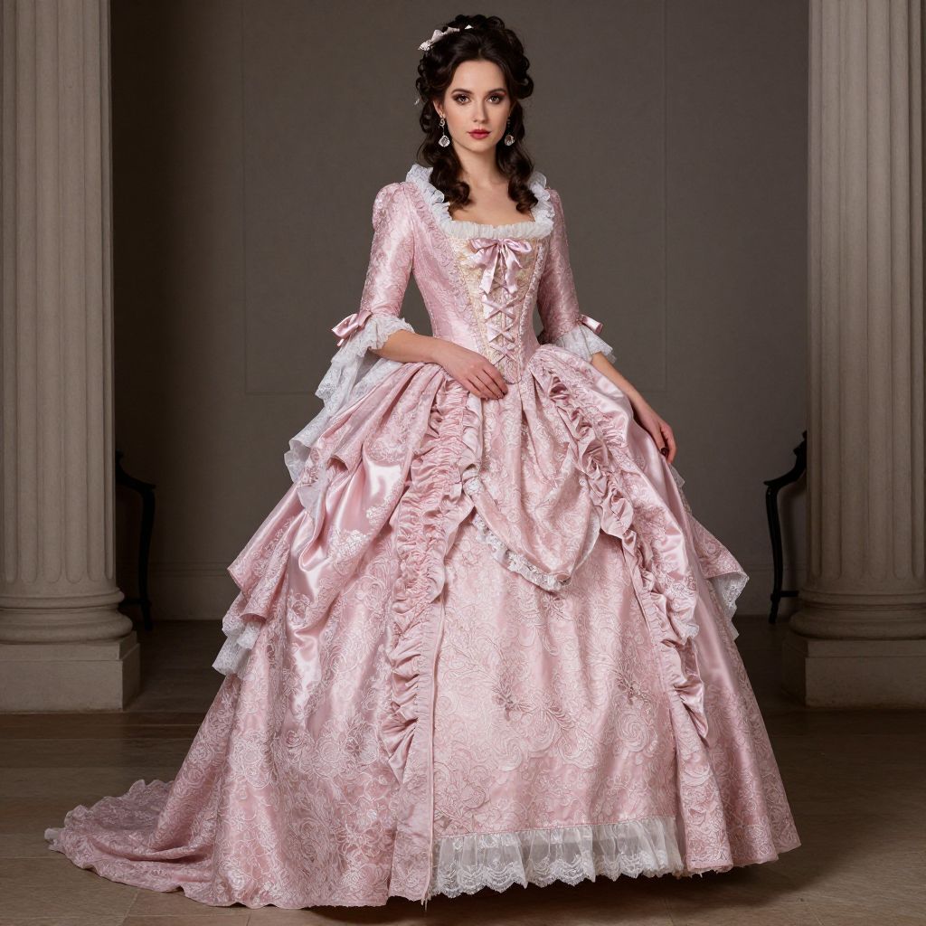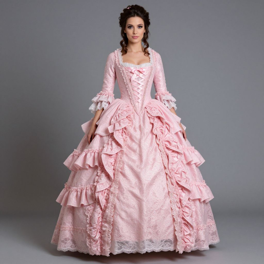 A woman elegantly poses in a high-definition Rococo-inspired pink lace-printed gown, reminiscent of Civil War Southern Belle and Marie Antoinette attire, featuring intricate ruffles and a dramatic silhouette perfect for masquerade balls or unique Halloween group costumes.