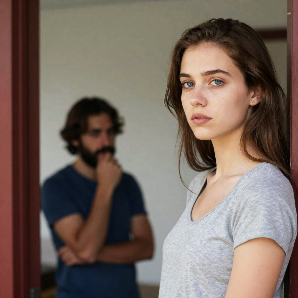 Photograph of a young woman with fair skin, brown hair, and blue eyes, standing in a doorway, looking to the side. A man with a beard, blue shirt, and medium-length dark hair sits in the background, blurred, chewing on his hand. White wall and red door in the background. Woman's expression is neutral. Man's expression is neutral, slightly distracted.