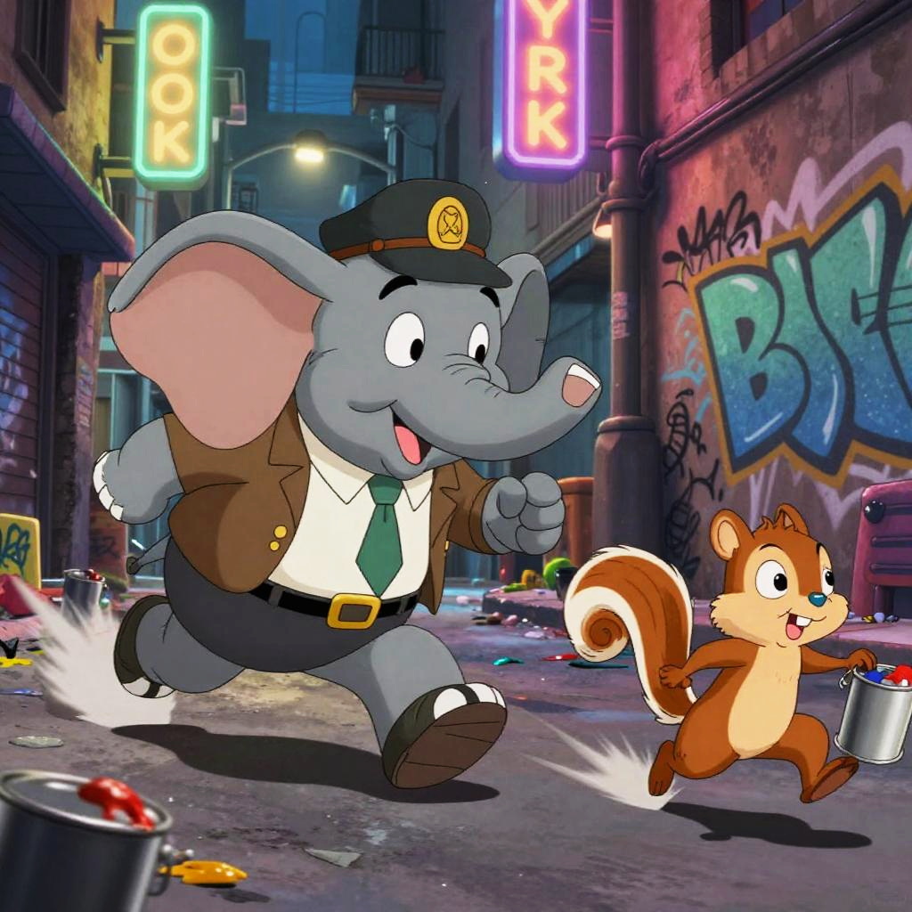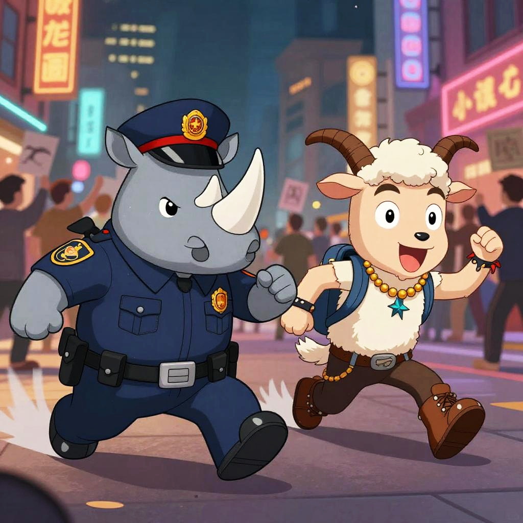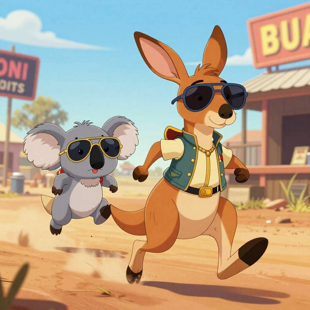 Two characterized animal cartoon characters: meerkat sheriff sprints after prairie dog pickpocket with patchwork vest through desert town at sunset; bold comic energy, clean lines, cel-shaded color, dynamic perspective, furry art, detailed costumes, cartoon mise-en-scene, expressive faces, motion blur, environmental storytelling props, neon signage, dramatic rim lighting, playful rivalry tone.