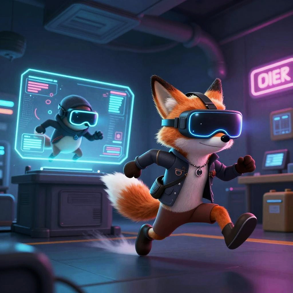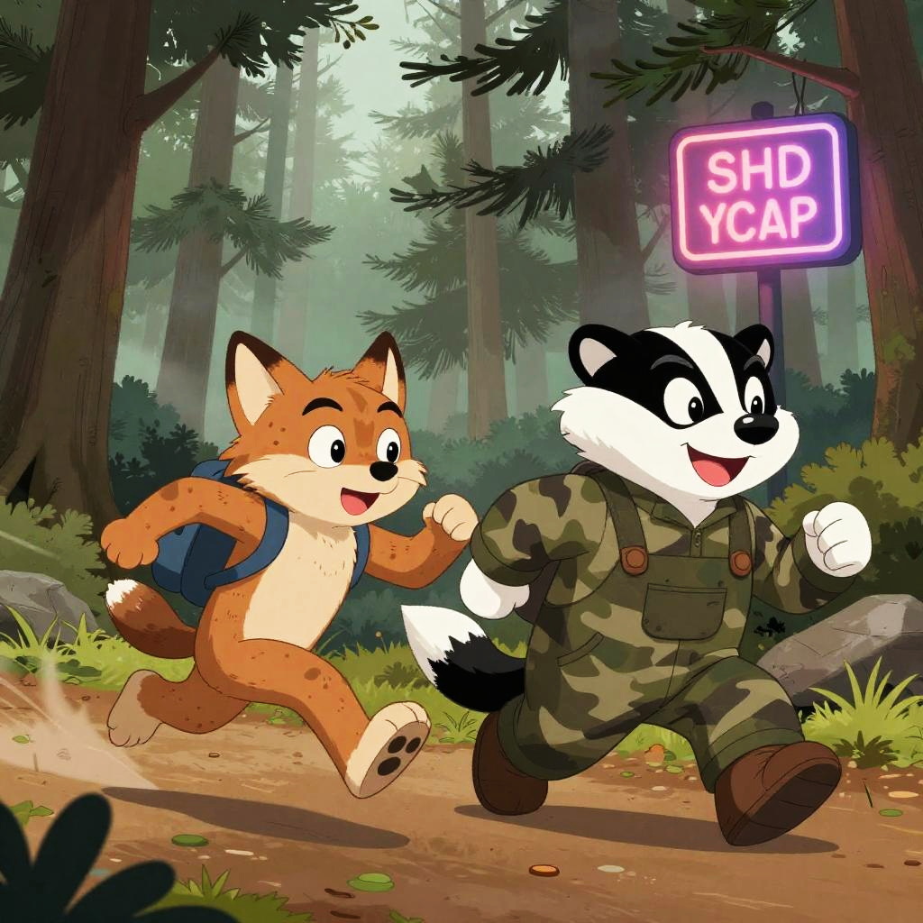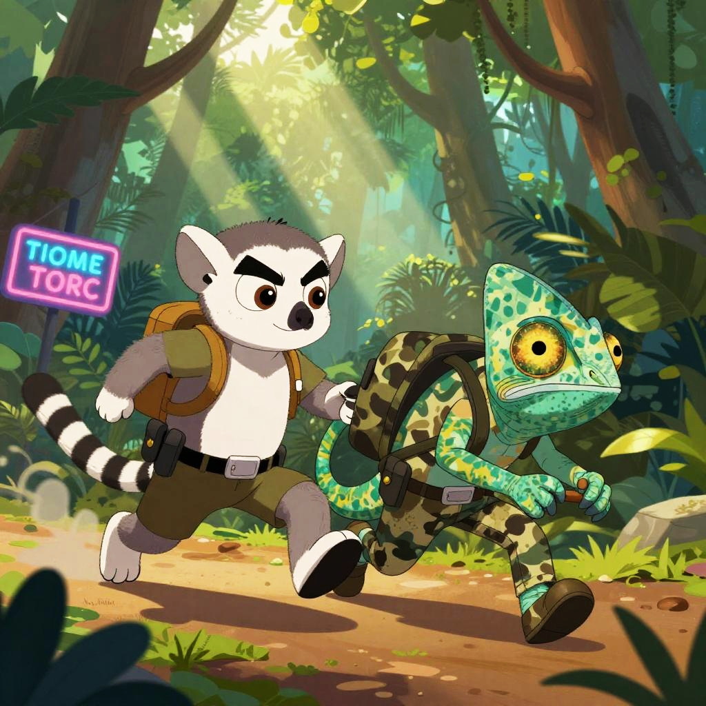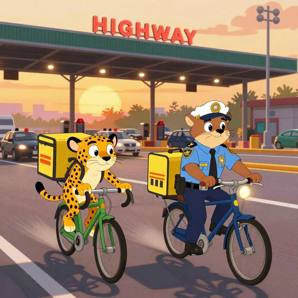 Two characterized animal cartoon characters: meerkat sheriff sprints after prairie dog pickpocket with patchwork vest through desert town at sunset; bold comic energy, clean lines, cel-shaded color, dynamic perspective, furry art, detailed costumes, cartoon mise-en-scene, expressive faces, motion blur, environmental storytelling props, neon signage, dramatic rim lighting, playful rivalry tone.
