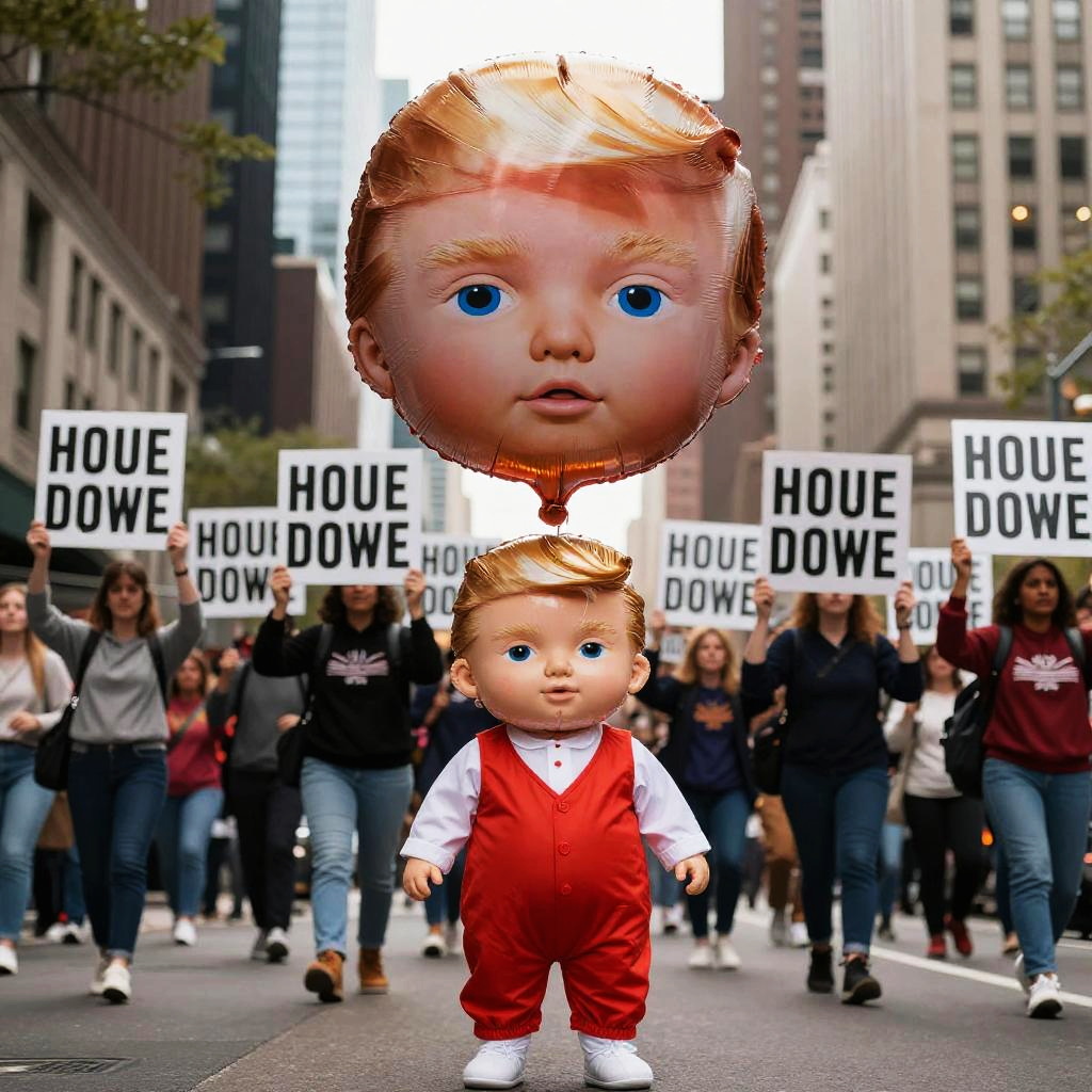Trump baby costume, a humorous political cartoon style illustration of a giant inflatable baby wearing a suit and tie, holding a smartphone, bright colors, satirical and playful mood, high detail