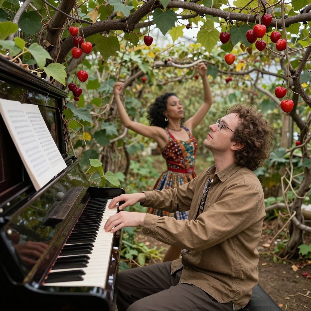 In a harmonious blend of nature and artistry, a musician's soulful melodies coax life from the piano, as vines and vibrant red fruits flourish in rhythm, symbolizing the transformative power of creativity and the eternal dance between man and nature.