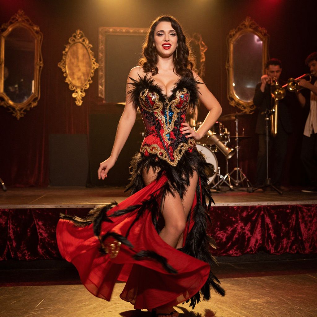 A stunning woman in her late 20s with long, wavy brunette hair and bold red lipstick performs as a burlesque dancer in a vintage cabaret setting. She wears a glittering feathered corset with ornate gold embroidery, flowing red and black feathered skirts that swirl in the dim, golden lighting of a 1920s-style club. The backdrop features a velvet stage with vintage mirrors and a dim, jazz-filled atmosphere, with live trumpet music echoing in the background.. The woman has big tits and cute face