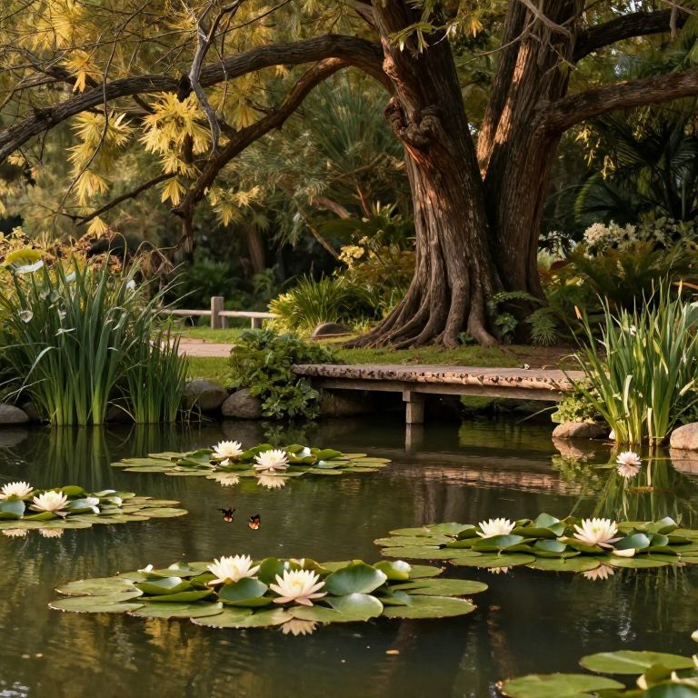 Gardenside view with a tranquil pond, water lilies floating serenely, delicate butterflies hovering, rustic wooden bridge crossing, backdrop of towering ancient trees, warm, inviting light filtering through branches, photorealistic nature setting