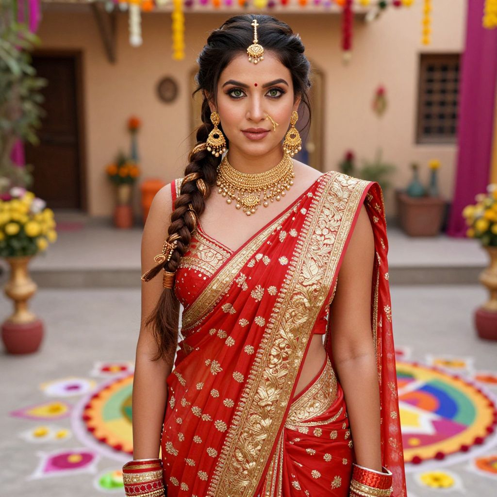 A beautiful Indian woman in her late 20s with warm brown skin, intricate braided hair, and deep green eyes, wearing a traditional red and gold silk saree with intricate gold zari work, standing in a vibrant courtyard during a traditional wedding celebration in Rajasthan, with flowers, rangoli patterns, and festival decorations in the background.. The woman has big breasts and cute face