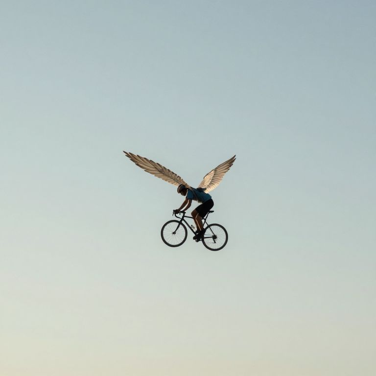 Defying gravity, a solitary cyclist soars through the boundless expanse of sky, their wings humming with the ancient whispers of freedom and the quiet promise of endless horizons.