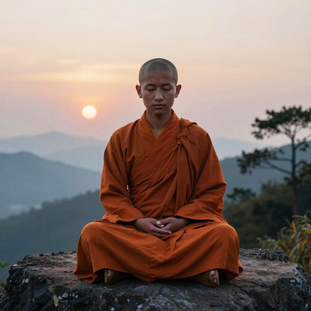 Serene Young Buddhist Monk at Sunset