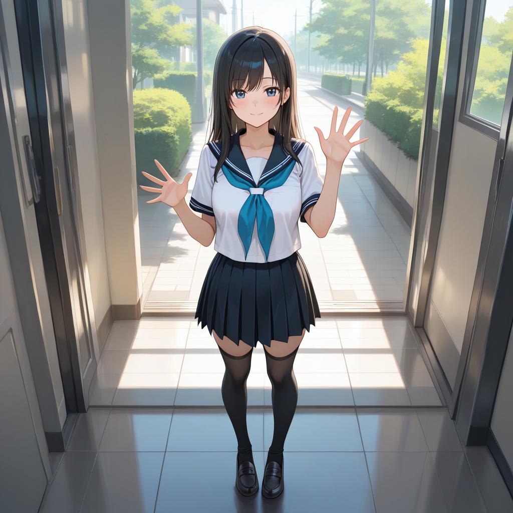 Anime-style illustration of a solo young girl with long dark hair and blue eyes, standing indoors near an entrance. She is wearing a traditional Japanese school uniform with a white sailor top featuring a blue collar and blue tie, a pleated black skirt, black thigh-high stockings, and black shoes. The girl is facing the viewer with her hands open in a friendly waving gesture. The background shows a sunlit outdoor pathway and greenery.