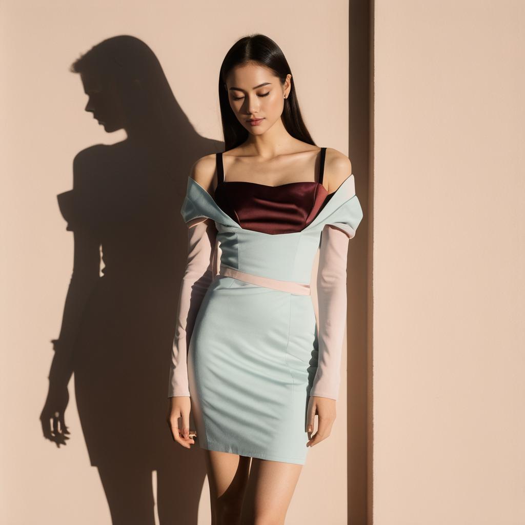 Portrait of an Asian young woman standing against a two-tone beige background. She is wearing a stylish deep navy blue and light blue off-shoulder bodycon mini dress with a straight neckline and an asymmetric design at the waist. Her long dark hair is straight and parted in the center. The lighting is soft and directional, casting a clear shadow behind her.